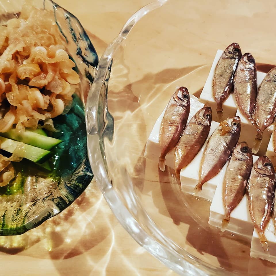 ものすごく小さいお魚がお豆腐の上に乗っているのがスクガラス豆腐です。