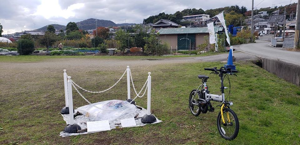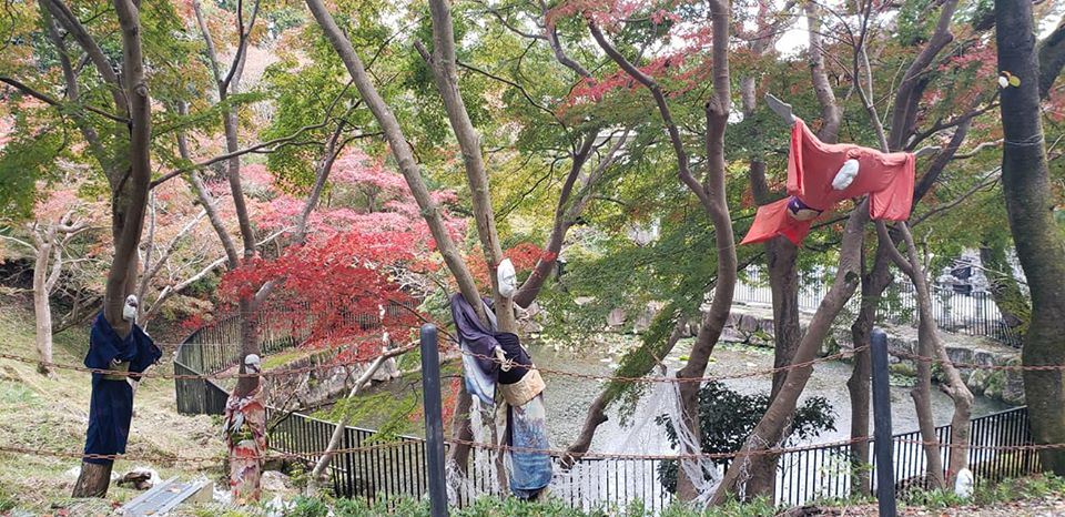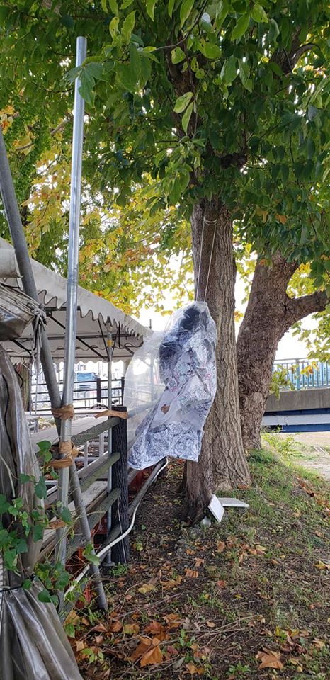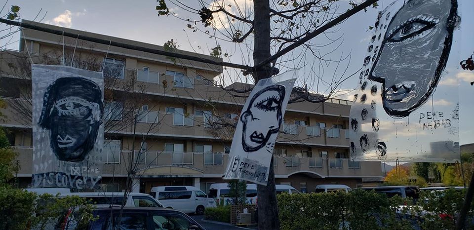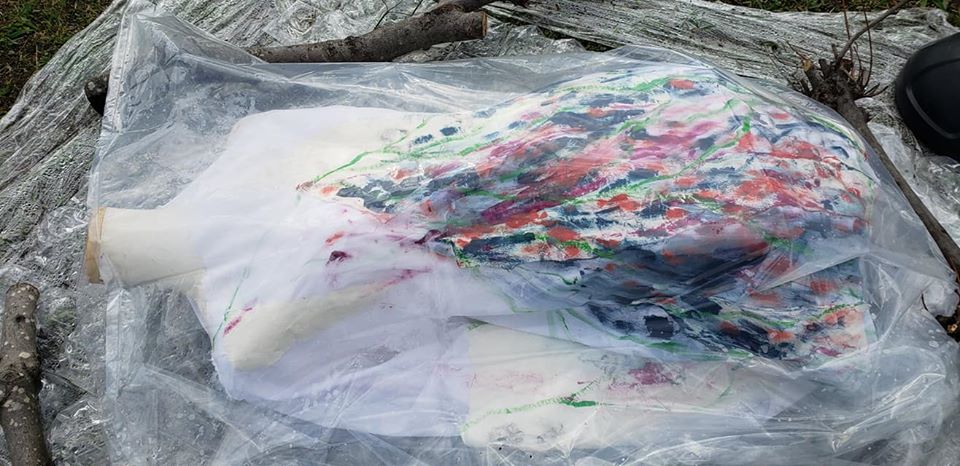 昨夜雨が降ったので、作品に使われてる布が濡れてしまっていて気の毒。