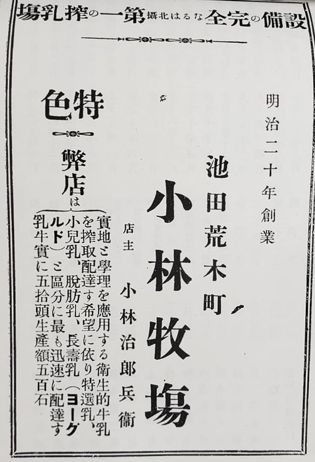 広告には「設備の完全なるは北摂第一の搾乳場」「衛生的牛乳」